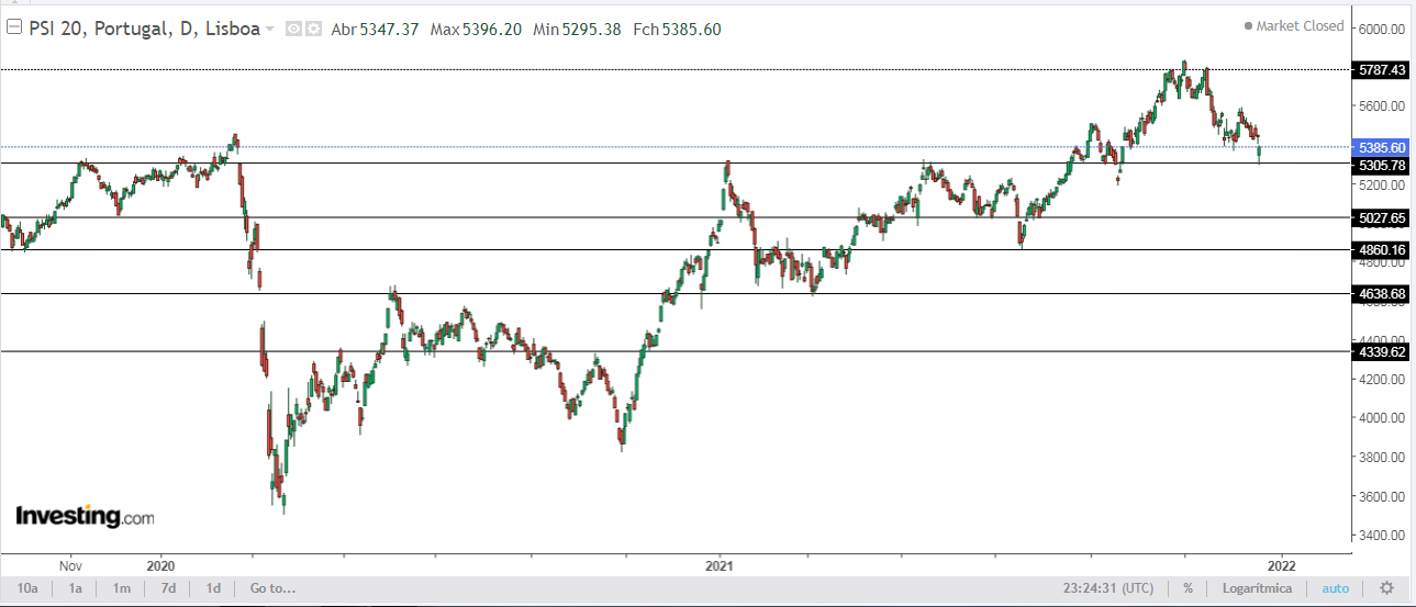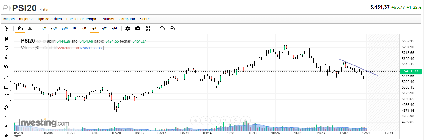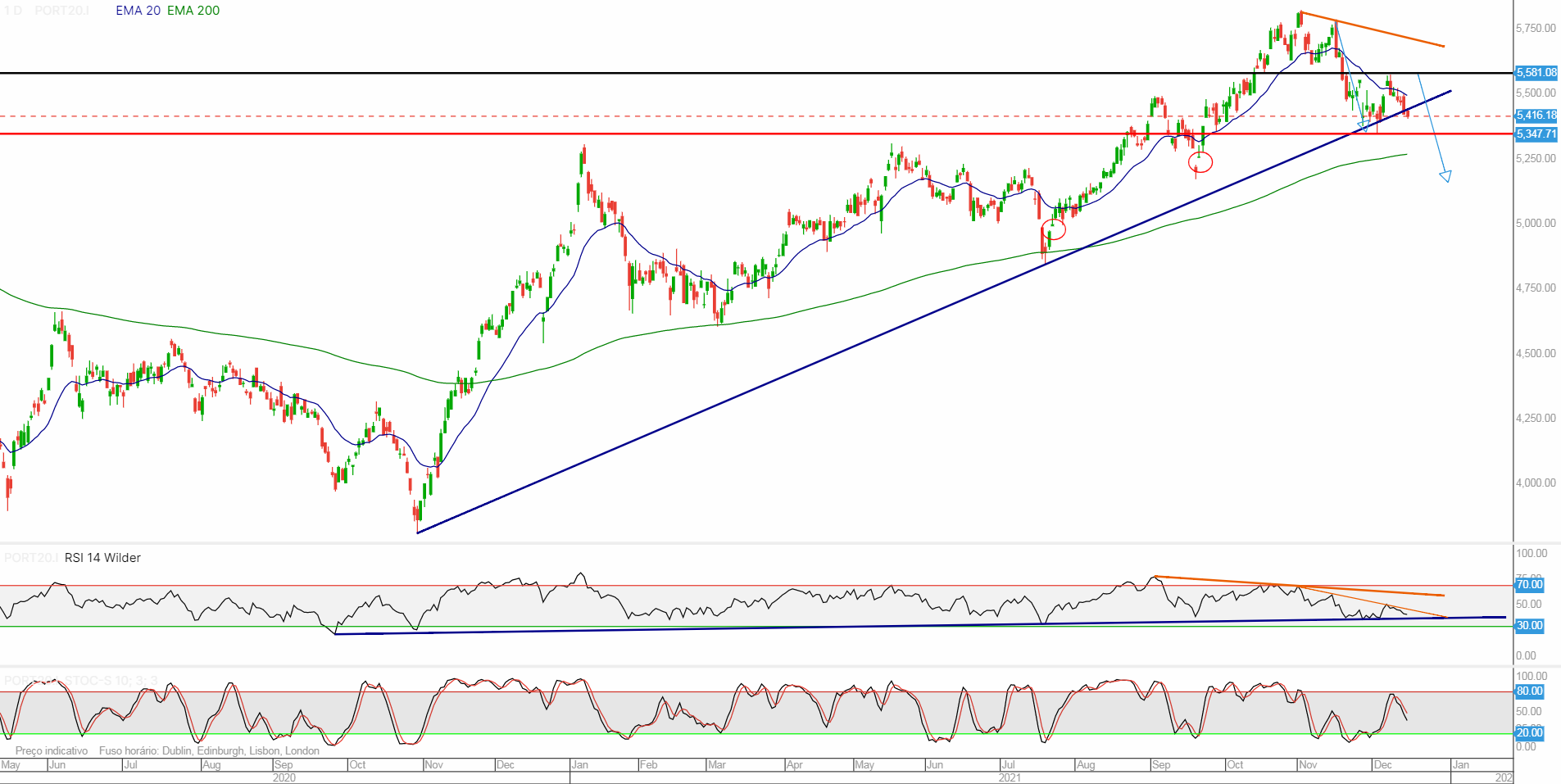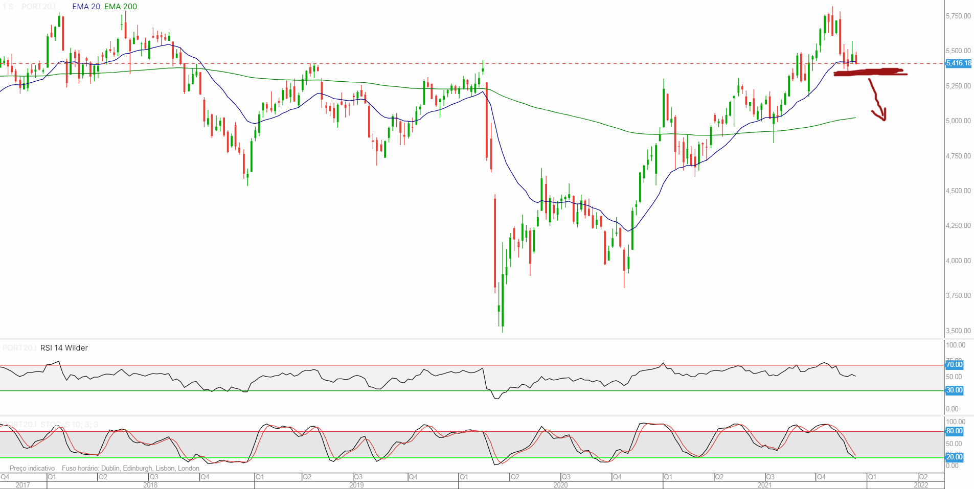 Deixo o gráfico atualizado do Psi20, em que hoje "tocou" na zona de suporte.