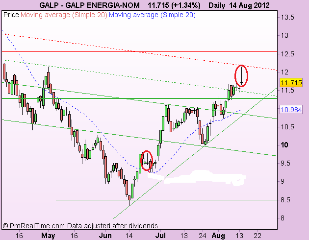 Por um lado temos o suporte dos 12, por outro a MA 50 = 12,50.Aquela que for vencida, ditará o rumo da GALP no curto prazo.