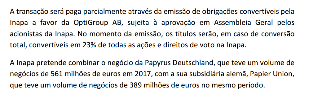 Para financiar a operação, de acordo com um comunicado emitido pela Inapa na CMVM, a empresa vai avançar com uma emissão de obrigações que no limite poderá dar à OptiGroup (que controla a Papyrus Deutschland) 23% do capital da empresa portuguesa.