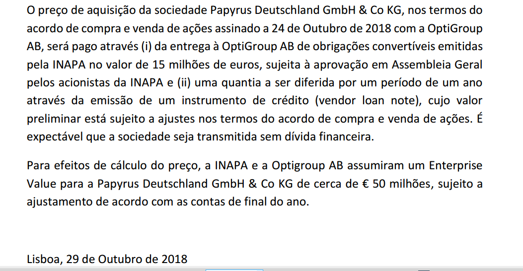 "Este é um passo importante na estratégia do nosso Grupo, que visa melhorar a eficiência do negócio de papel. Com a aquisição da Papyrus Deutschland, a Inapa reforçará a sua posição no maior mercado europeu, a Alemanha", refere o CEO no comunicado.