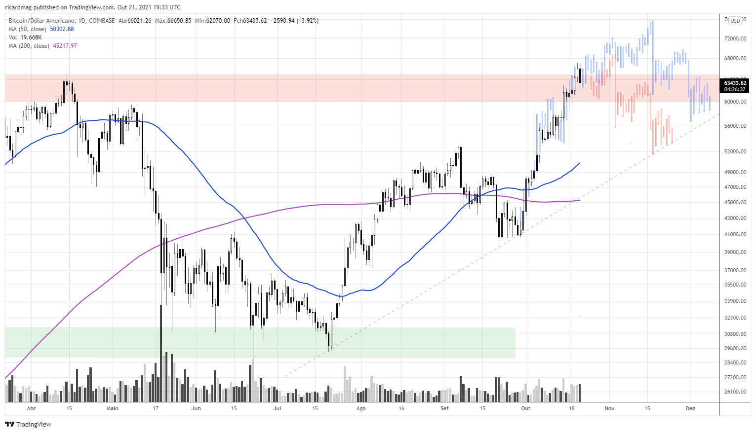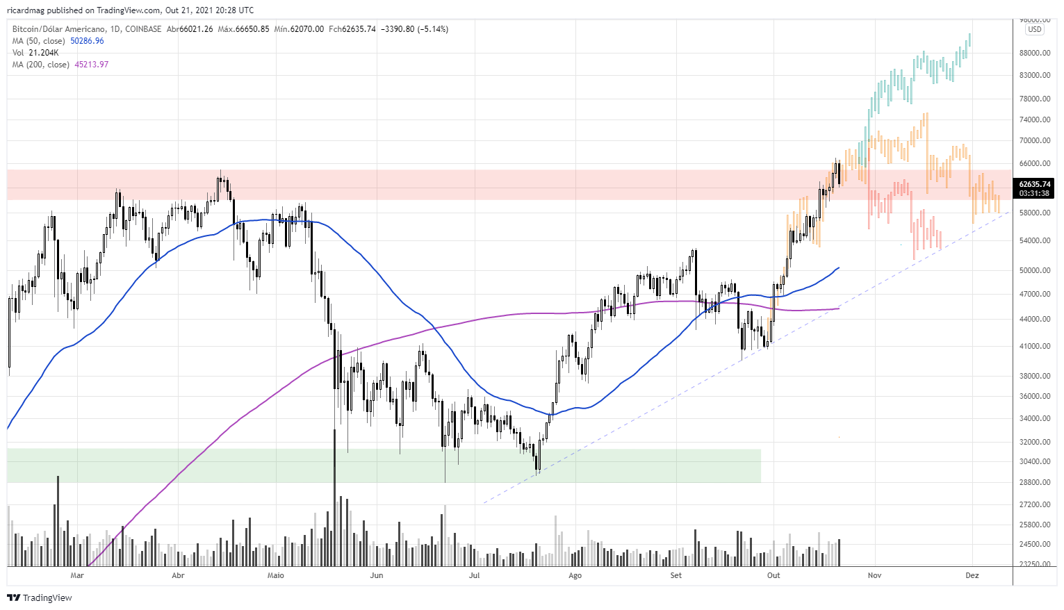 Optimiza Escreveu:1 » BITCOIN » Hoje estamos, finalmente, em saudável processo correctivo na Bitcoin (e, com exceção do Ether, por arrasto em quase todos os crypto assets, da Coinbase aos NFT's, da Litecoin ao XRP). O meu target Bull projeta uma visita à Rf1 nos $72.700 no início de Novembro.