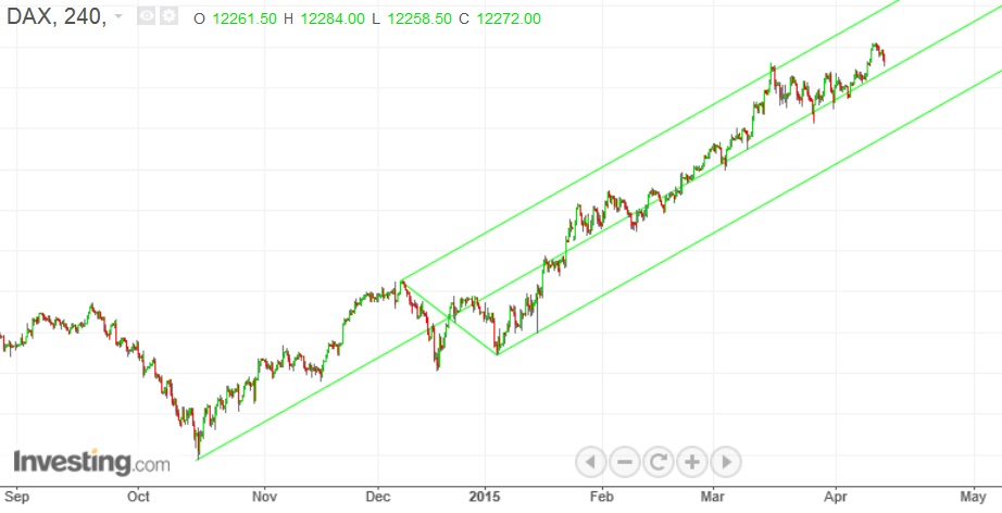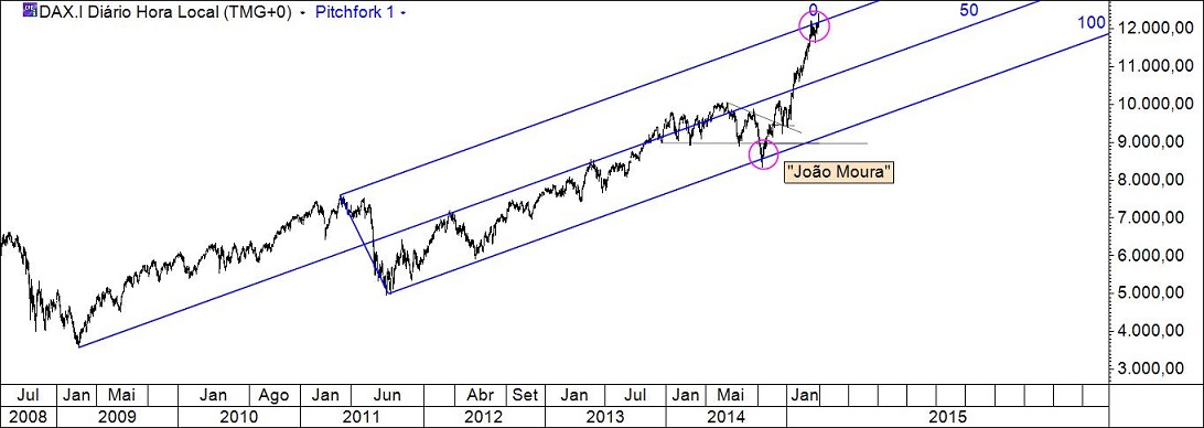 No dia 25/11/2014 dissee apresentei o gráfico que reproduzo em baixo (o primeiro).Levou o seu tempo mas também o Dax conhece o padrão "João Moura"