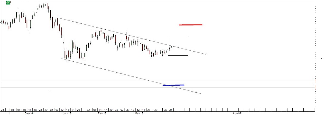 Nova oportunidade especulativa: vendendo esperança num mercado descendente. Aguarda-se que o preço se digne mostrar o que pretende fazer quando chegar à zona assinalada. Se aí mostrar aquilo que quero que mostre (fraqueza), será efectuada uma venda com stop e target nos locais assinalados.