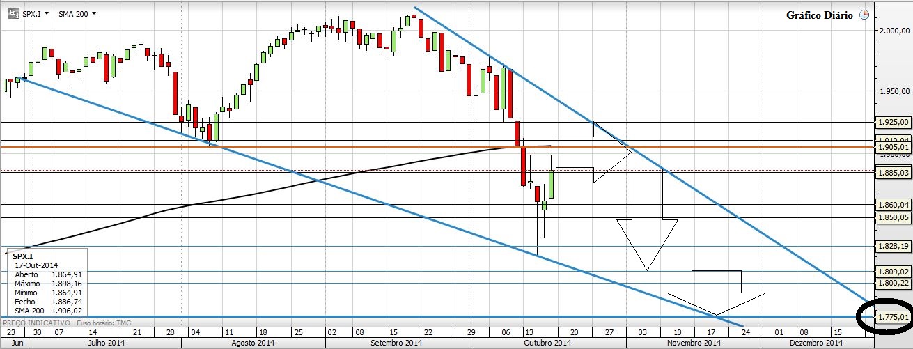 Deixo aqui a minha ideia para o S&P500: Pequena subida/lateralização para depois iniciar novamente o sentido descendente.