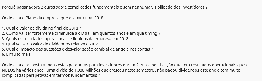 Investidores até MARÇO ou ABRIL de 2019 têm zero visibilidades sobre Resultados , dividas, dividendos , redução de divida , impacto dos resultados de angola e outros nos resultados .