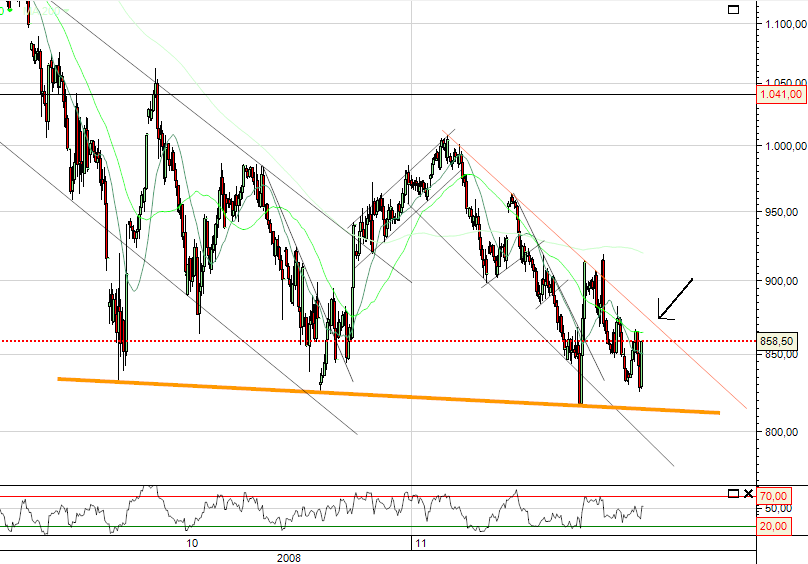 para mim está tudo na mesma, continua entre as duas linhas laranja, sendo que a quebra da mais grossa, tenho forte convicção, vai precipitar as quedas e a quebra da mais fina e equivalente ltd do gráfico diário, permitirá ao índice subir até aos 950 pontos.
