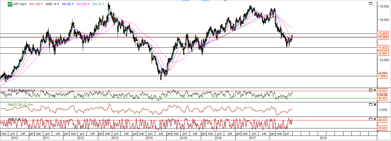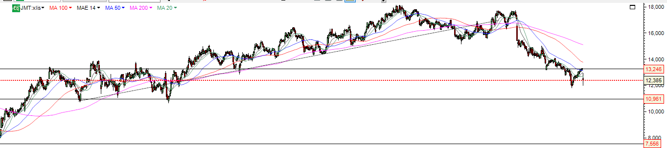 Quanto à análise técnica da acção nada de novo. A JM continua na sua tendência descendente identificada em Março, na altura da quebra do suporte nos 15,4 e agora, depois de um ressalto até uma resistência, bateu lá de cabeça e retomou a sua tendência.