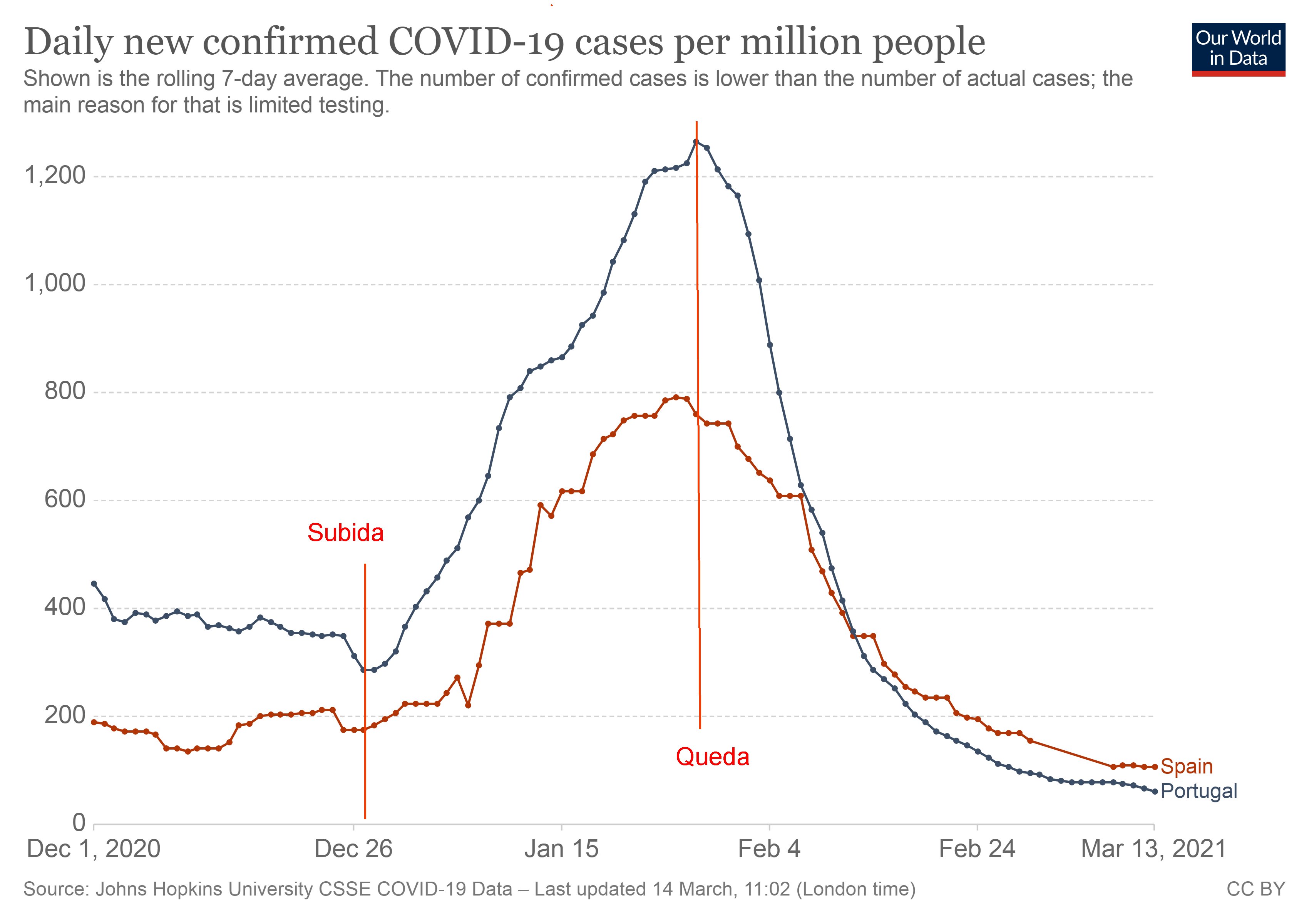 Portugal e Espanha tiveram evolucoes semelhantes desta vaga com medidas diferentes, e medidas essas adoptadas em alturas diferentes. Deve ter sido o lockdown Portugues que fez cair os casos em Espanha.