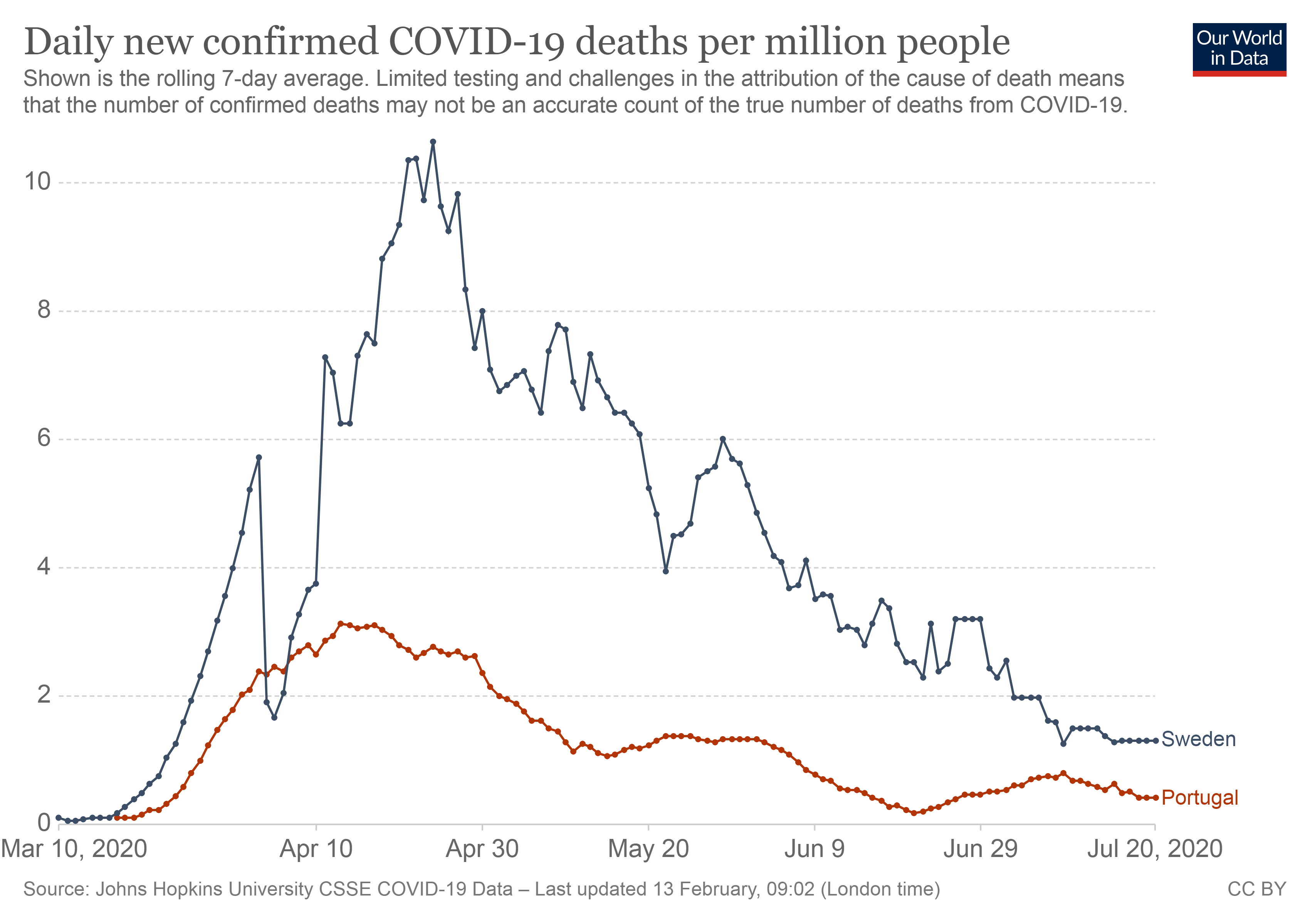Mas isso nem é importante, eu alguma vez disse que a Suécia tinha adotado a mesma estratégia que os outros países? Claro que não, mas os resultados estão à vista... compara com os países que faz sentido comparar (os vizinhos nórdicos) e os resultados em termos de saúde pública são esclarecedores! Eu até admito que se possa defender que é um risco que devemos correr, não aceito é que tu fazes, tentar passar a ideia que o risco é o mesmo... escusas de fazer aqui as comparações com Portugal porque isso não faz sentido!