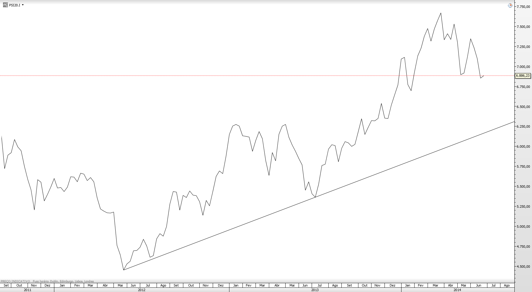 C78 Escreveu:O PSI20 esta semana não teve mínimos inferiores aos de 16 de Maio, o que foi muito importante para a continuidade deste bull-market. Tal como há um ano atrás, o "irrevogável do Paulo Portas" fez crer que o suporte 5700-5550 teria sido quebrado de vez, na minha perspectiva e tendo entrado longo recentemente em algumas acções do PSI20, acho que o suporte à volta dos 7150 pontos poderá não virar resistência e poderemos aguardar mais uns 9-10 meses de subidas no PSI20. Nos últimos 2 anos, os arranques para as subidas verificaram-se em Julho, após o mal-amado 2º trimestre, e corresponderam a valorizações de cerca de 45% no índice. E julgo que, após estas indefinições na banca portuguesa ficarem concluídas, as subidas serão ainda maiores diariamente, devido ao peso que o BCP e o BES têm no índice. E mais, temos acções com bastante peso no índice, como a Galp e a EDP (representam juntas cerca de 1/3 do PSI20!!!), com tendência claramente bull. Deixo os gráficos, onde se pode visualizar a possível formação de um duplo-fundo, com projecção nos 8300 pontos.