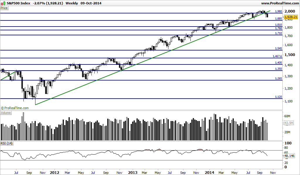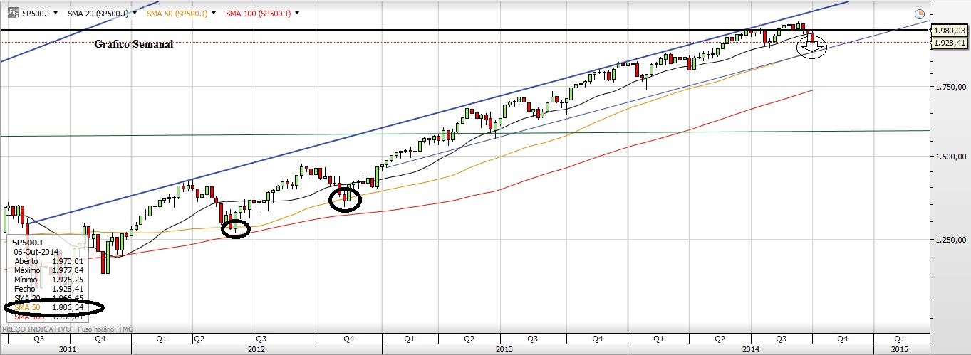 Estive a olhar para os gráficos e acho que o Preço vai parar de cair nos 1886 mais ponto menos ponto. Porquê? Primeiro porque olhando para o Russell parece existir ali uma zona que pode aparar a queda e que é o alvo do triângulo simétrico e também uma zona de resistência/suporte. Naquele local julgo ser muito provável uma reacção em alta. Percentualmente falando está a uma distância mais ou menos idêntica à dos 188ss do S&P500. Depois no Semanal essa é a zona onde está a M50, das últimas duas vezes que o Preço lá foi não esteve muitos tempo por baixo dela, reagindo depois em alta. Curiosamente se o Preço ficasse por ali dava um bonito canal ascendente (escala logarítmica!)...