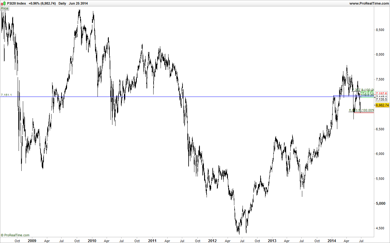Se o movimento de correcção entre Maio e Julho do ano anterior for «replicado» teríamos uma queda até ao suporte dos 6.507 o que coincidiria com a activação plena do H&S que se formou entre Fevereiro e Maio deste ano. Quebraria o suporte dos 6.700, esperemos que pelo menos não quebre o mencionado. Se quebrar a situação vai ficar complicada...