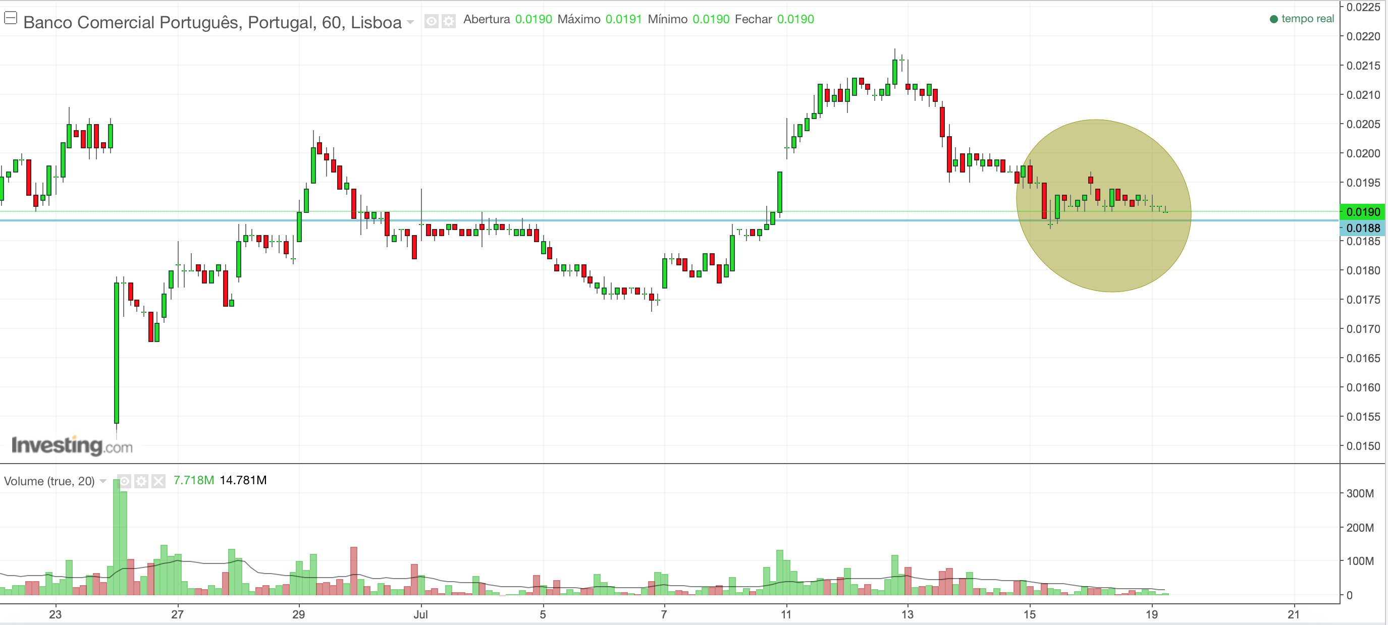 Para já nada de novo no gráfico de 1H. Os 0,0188€ aguentaram na 6ª feira e a acção lateraliza