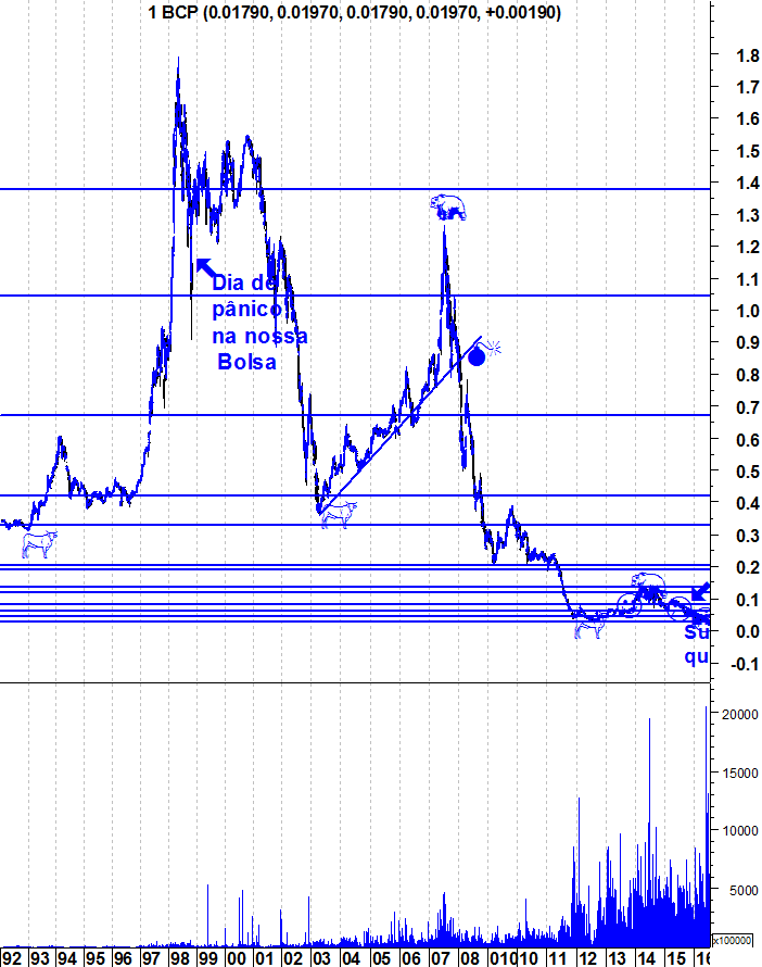 Deixo o gráfico de longo prazo para perceberem quem tem ganho dinheiro nos últimos 25 anos do BCP - quem foi acompanhando as tendências, mesmo que entrando tarde e saindo tarde.