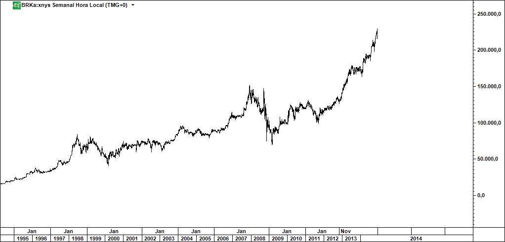 Ora então aqui fica uma "sugestão": sigam a estratégia do Buffet. Como? É fácil: comprem a empresa dele cotada em bolsa, a A ou a B tanto faz (aqui fica um gráfico da A). E depois fiquem quietos e calados pois nada do que fizerem ajudará à cotação.