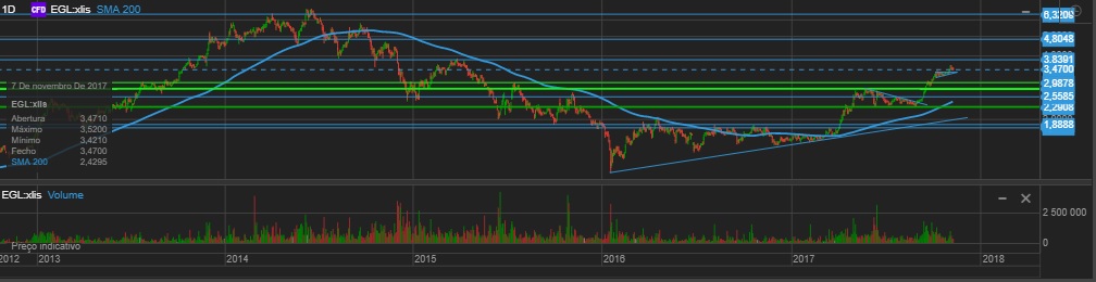 De qualquer forma a zona dos 2,90-3,00 é para se olhar com muita atenção, pois até aí, no meu entendimento, tecnicamente o título se mantém BULL se não houver uma quebra consistente nessa zona. Seria bom para o título, a se confirmar, que essa zona demorasse algum tempo para ocorrer, pois assim a consolidação seria mais eficaz.