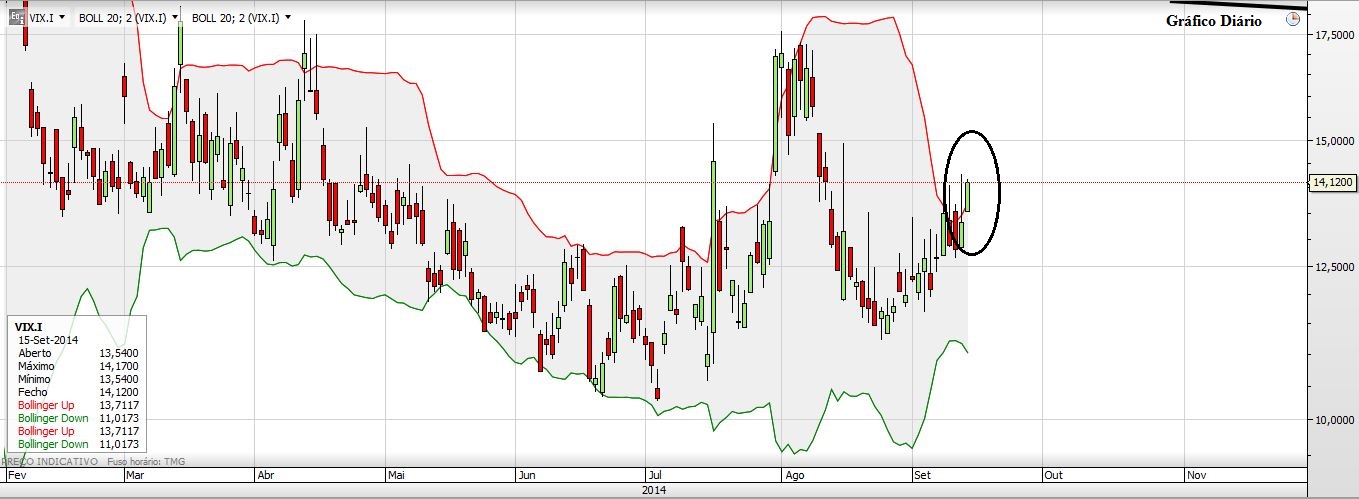 A questão do VIX relaciona-se com um fenómeno que, estatisticamente falando, deverá ser encarado com atenção pois é um sinal Bull aqui conhecido como D.L. e aqui dado a conhecer pelo caríssimo Zecatreca. Basicamente quando uma vela fecha fora da BB superior e posteriormente faz dois fechos (diáriamente falando) dentro das BB´s temos o fenómeno activado e consequentemente é um sinal de subida no S&P500.