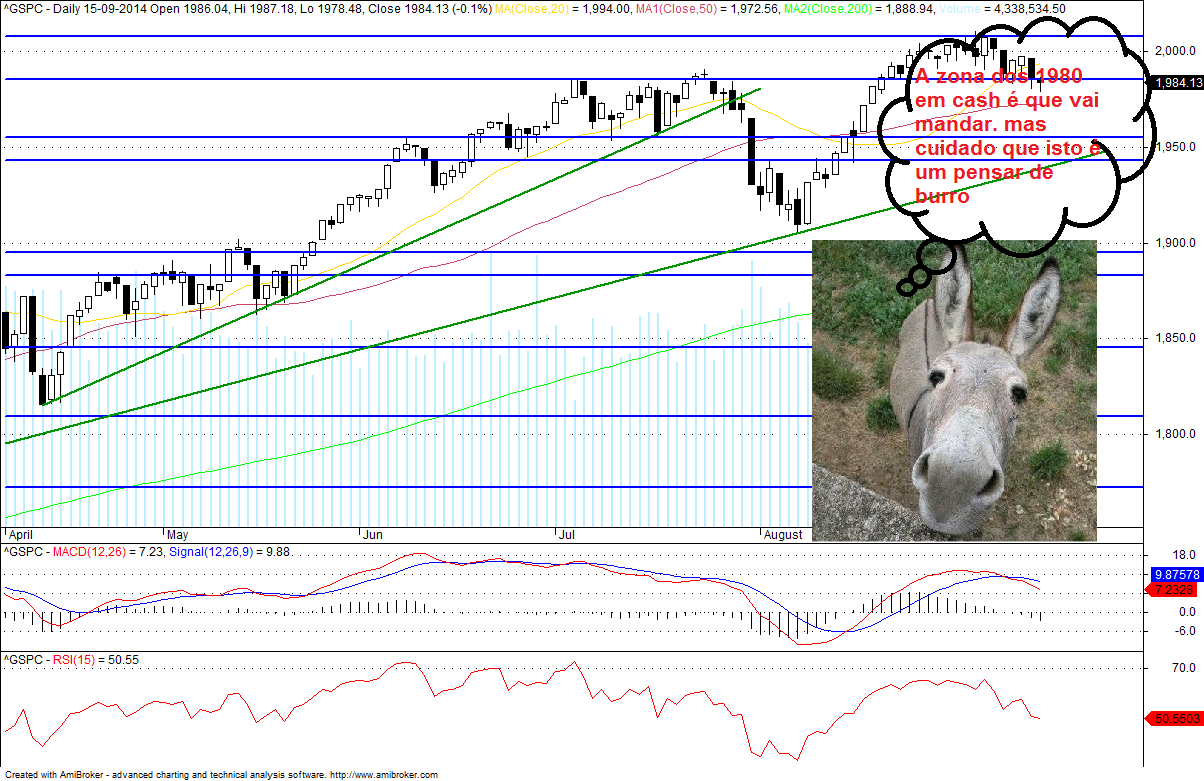 Eu hj concerteza vou me desfazer da posição curta que tenho nas small caps pq vem ai a reuniao do FED e isto de estar a adivinha não é pra mim. Eu na minha modesta opiniao axo que o indice S&P vai lateralizar até ao fim do ano até manter-se este discurso do "nim" da FED pq o discurso continua a mesma coisa.