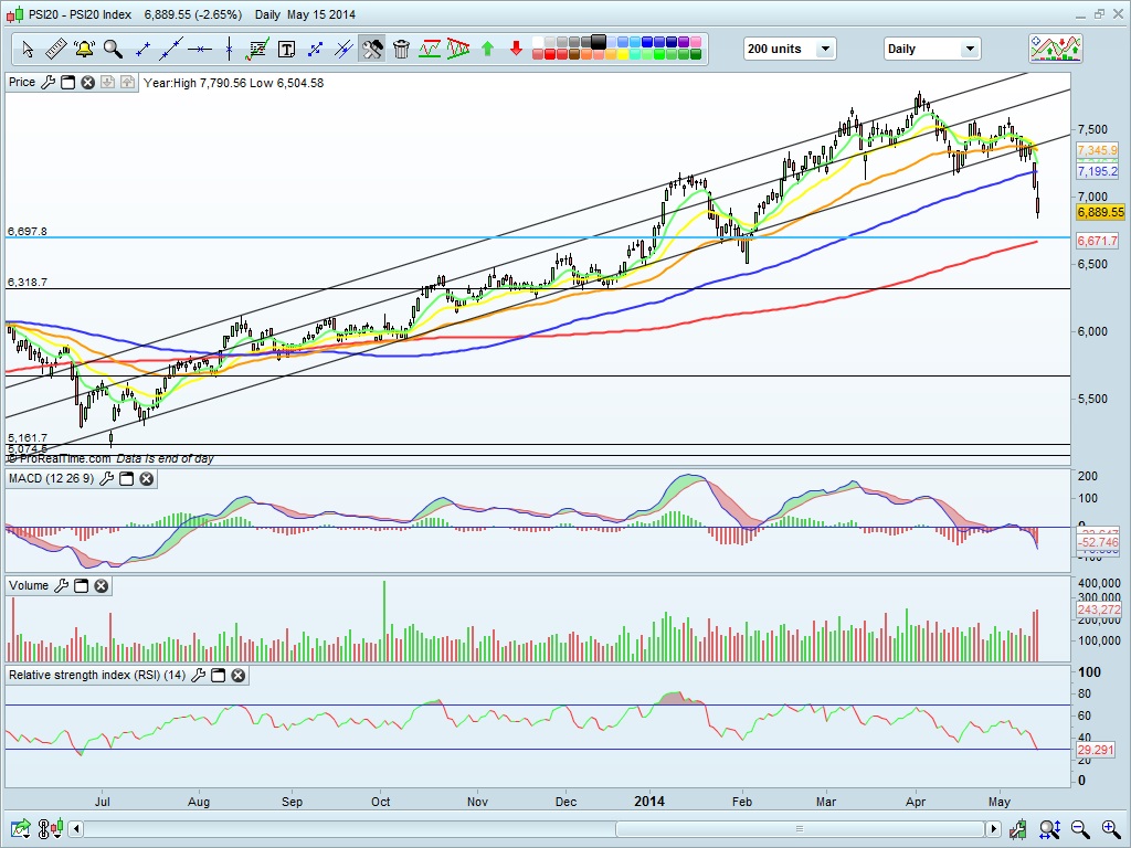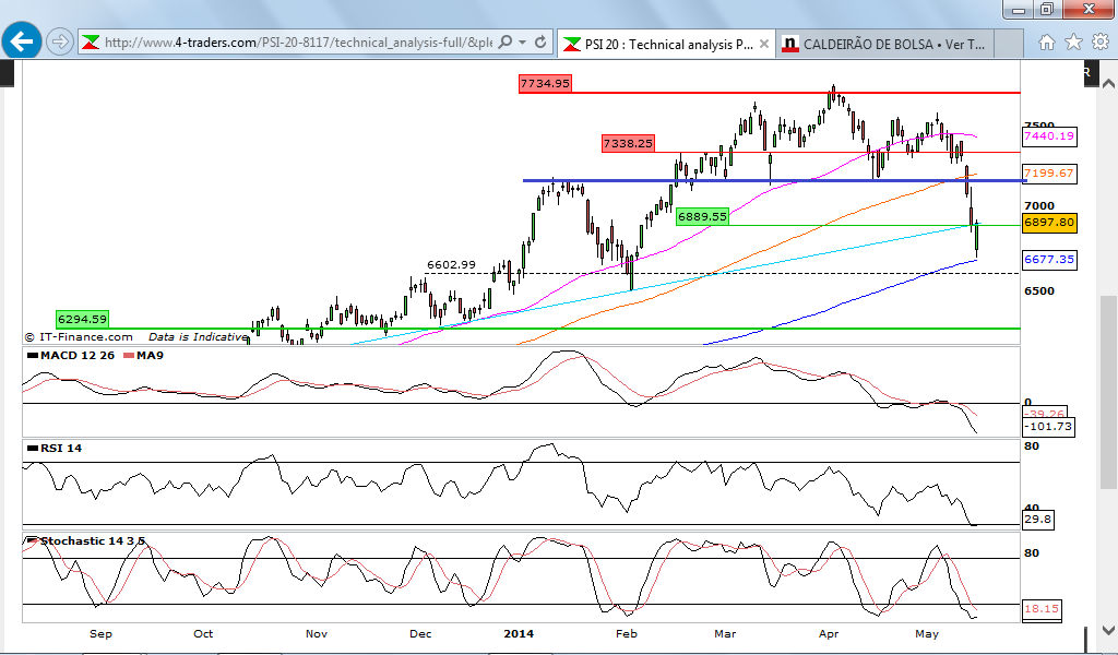 - Possível H&S embora os volumes não correspondem às regras clássicas do mesmo. No caso da plena activação atiraria o índice para os 6507, suporte de 4.Fev.2014, tendo ontem 17.Maio.14 chegado no ponto mínimo aos 6700,30, tendo quase tocado a MM200