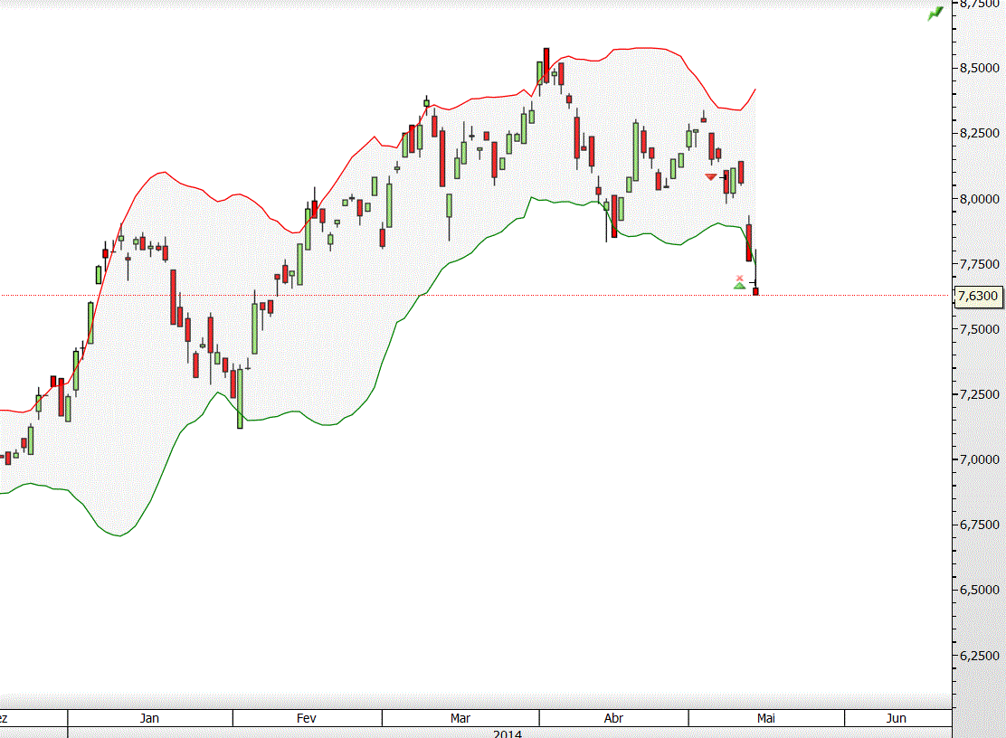 Porém, a normalidade (o que não quer dizer que seja o caso) aponta no sentido de que com indicadores técnicos na zona de sobrevenda e cotação bastante abaixo da banda de bollinger inferior pode acontecer um pulback com mais consistência e depois, então sim, a abertura de espacço para a continuação da queda.