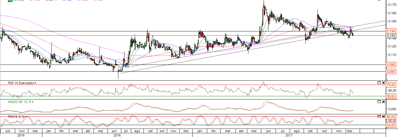 de qualquer maneira, hoje o papel, embora com pouco volume deu o primeiro sinal de INVERSÃO, no diário. No de 4 horas já vai mais adiantado. Ainda utilizando as contas percentuais anteriores: e partindo duma base de: 0,129, com uma subida de 38% atiraria o papel para os: 0,178 valor do Máximo de 44,7% de valorização. Mas se admitirmos que depois deste Máximo teremos um eventual travão nos: 0,194 a isto corresponde uma subida de: 50%,...
