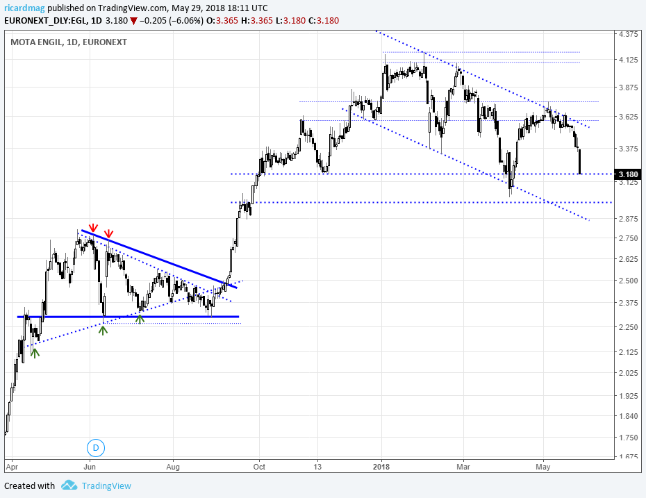 Apesar do suporte mais próximo (na zona dos 3,16x) poder travar algumas quedas, a tendência é para baixo, estando desde o inicio do ano a fazer lower lows e higher lows.