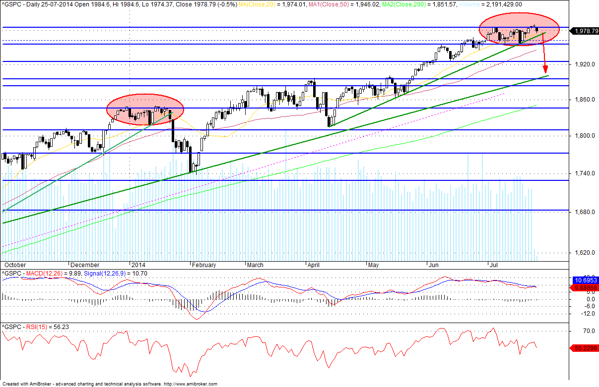 só mais este pormenor do spy onde se pode ver bem o padrão de velas de exaustão que ficou criado no grafico diario