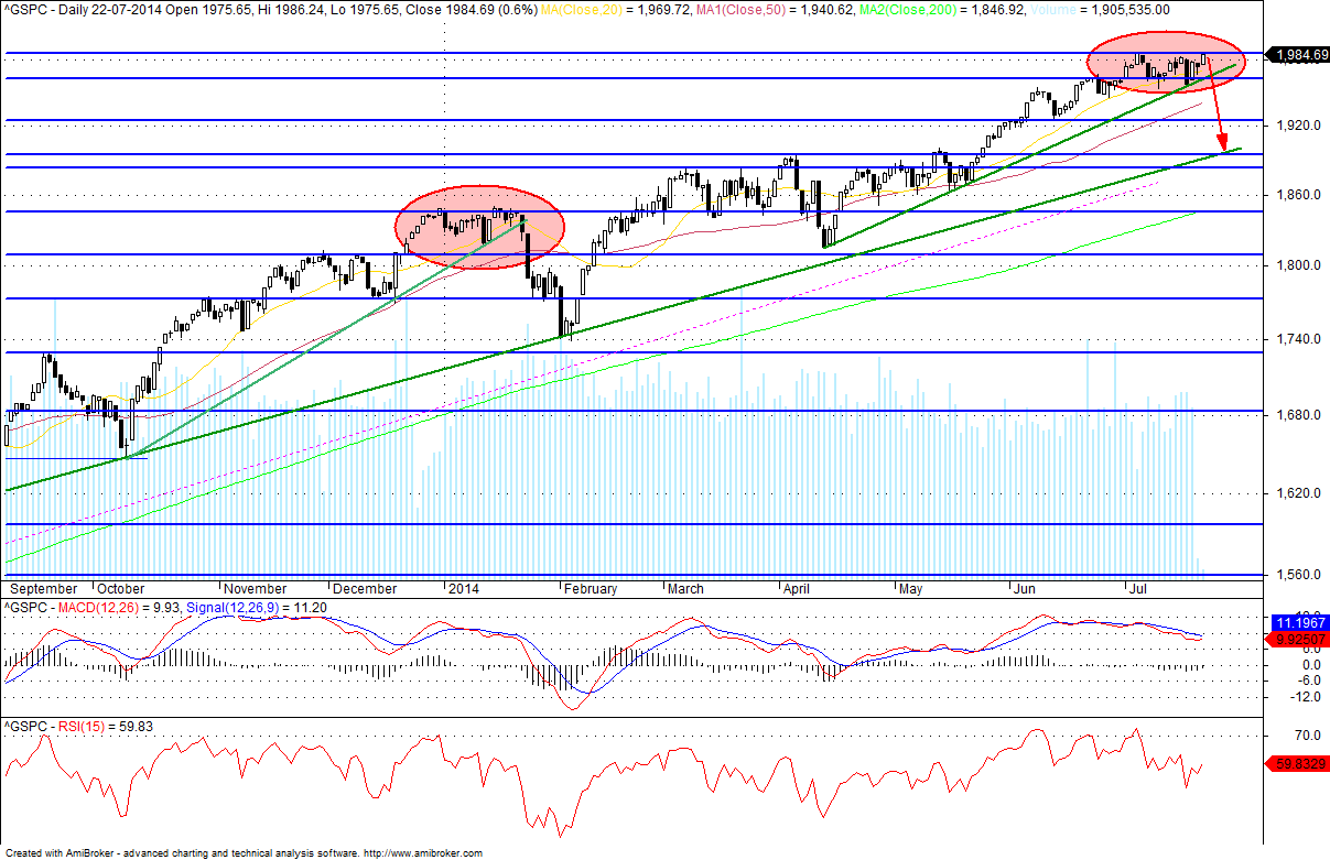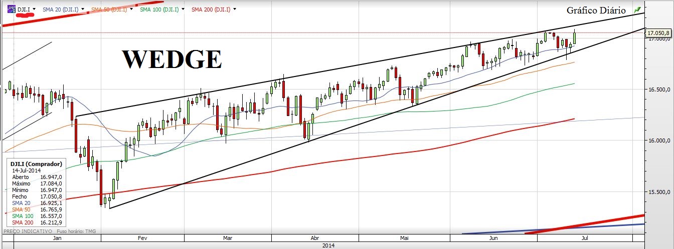 Podem vir com a história do avião, mas se não fosse o avião seriam os Israelitas e Palestinianos ou até podia ser o BES. A verdade é que o preço no DJ não conseguiu passar a linha superior da Wedge, e andou que tempos a tentar quebrá-la, como não conseguiu começou a perder força e começou a cair mesmo antes do fenómeno avião.