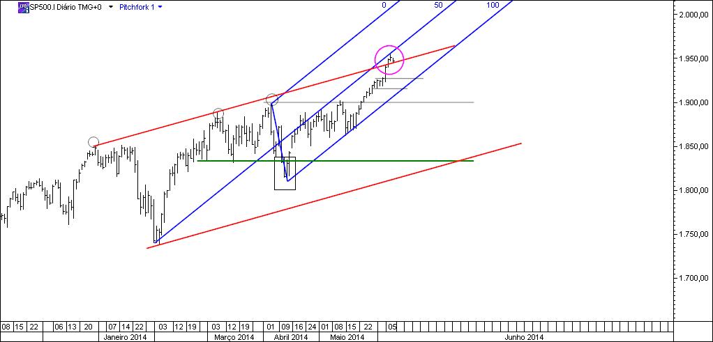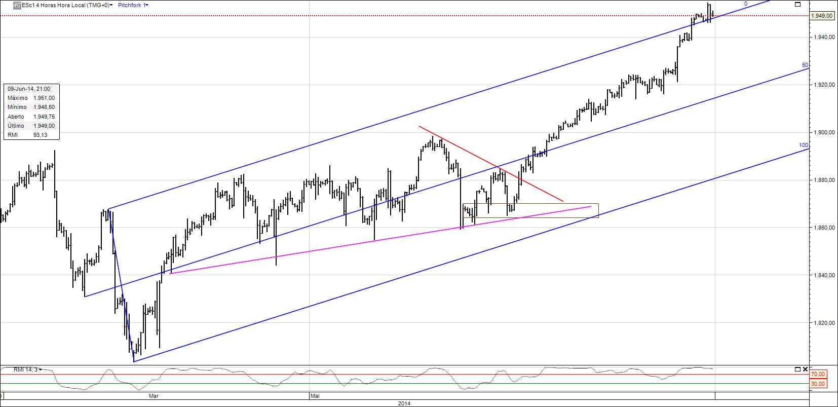 No segundo gráfico podemos observar que o mercado tem desenhado um canal ascendente perfeito que já dura quase um mês e que já se torna demasiado óbvio. Portanto, provavelmente deverá ser quebrado em baixa dentro de poucos dias. Creio que após a quebra em alta dos 1961 pontos o mercado deverá iniciar uma correção severa.