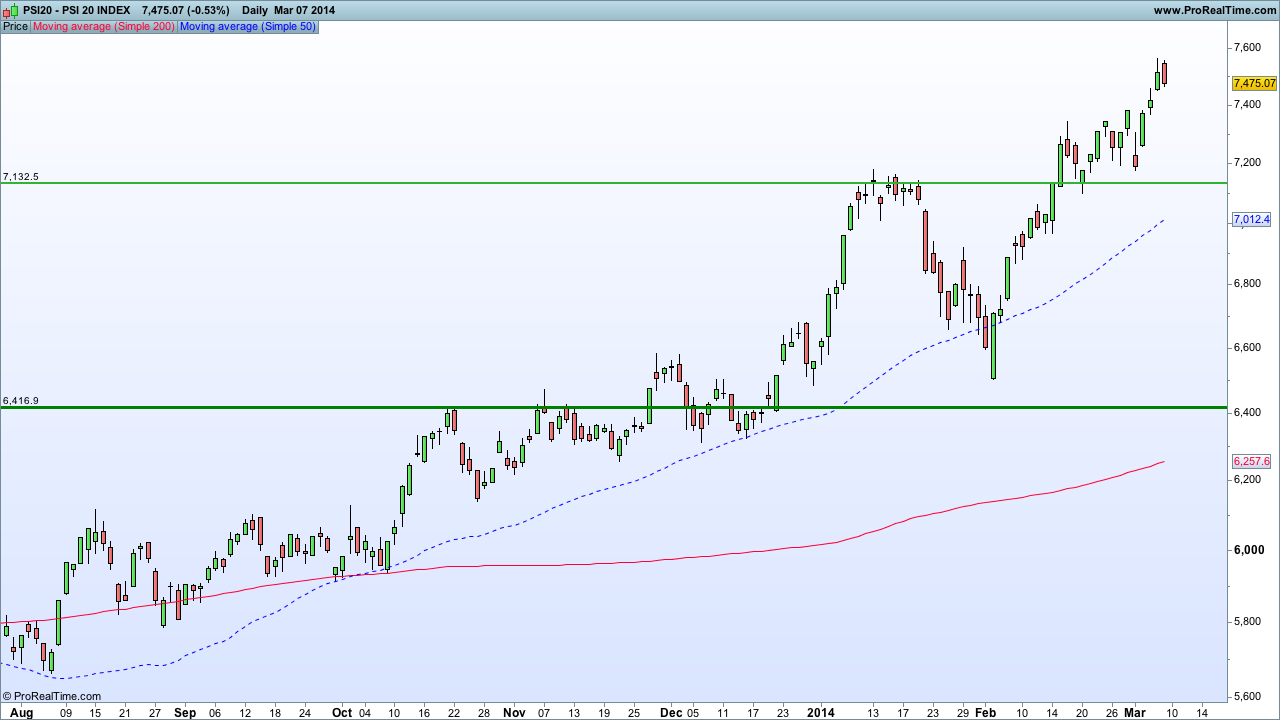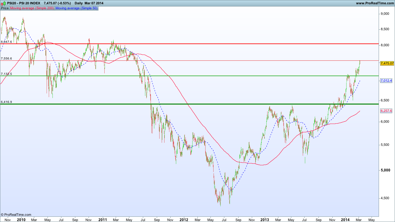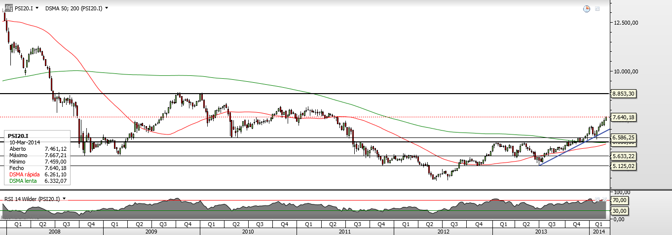Entretanto, no PSI 20, os 8000 pontos aproximam-se vertiginosamente. O PSI 20 já está a menos de 7,5% de lá chegar.