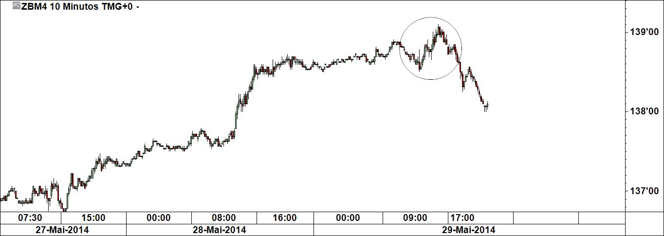 Para um exemplo veja-se o gráfico anexo onde se pode ver a pressa que os compradores revelaram na área seleccionada, visto que vinham assistindo à subida de fora e saltaram para o comboio com ele em alta velocidade. E veja-se o que aconteceu a seguir. É um exemplo recentíssimo (de hoje) e de um mercado relativamente ao qual apresentei no meu tópico uma oportunidade especulativa (já fechada).