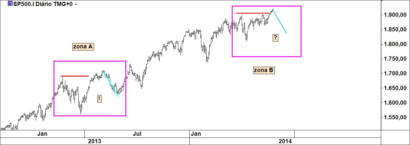 Tentando completar a resposta anterior, fui dar uma vista de olhos ao gráfico diário do sp, todo despidinho de linhas e indicadores. Nele assinalo a zona A que será o tal "topo em modo suave" por se tratar de um índice e assinalo também uma zona B que poderá ter alguma semelhança com a A. Quem está curto e confortável limitar-se-á neste caso a fazer o average up. Quem está de fora, como eu, :pray: para que a correcção venha depressa e de preferência com violência, para ver se acaba este discurso do "corrige-não corrige", "cai hoje-não, cai amanhã". Na certa o discurso alterava-se para "quando é que a descida acaba?/quando é que podemos comprar?"