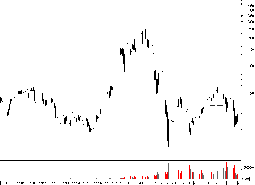 Esta menina está desde Outubro do ano passado numa lateralização entre os 22 (suporte) e os 30 euros (resistência).