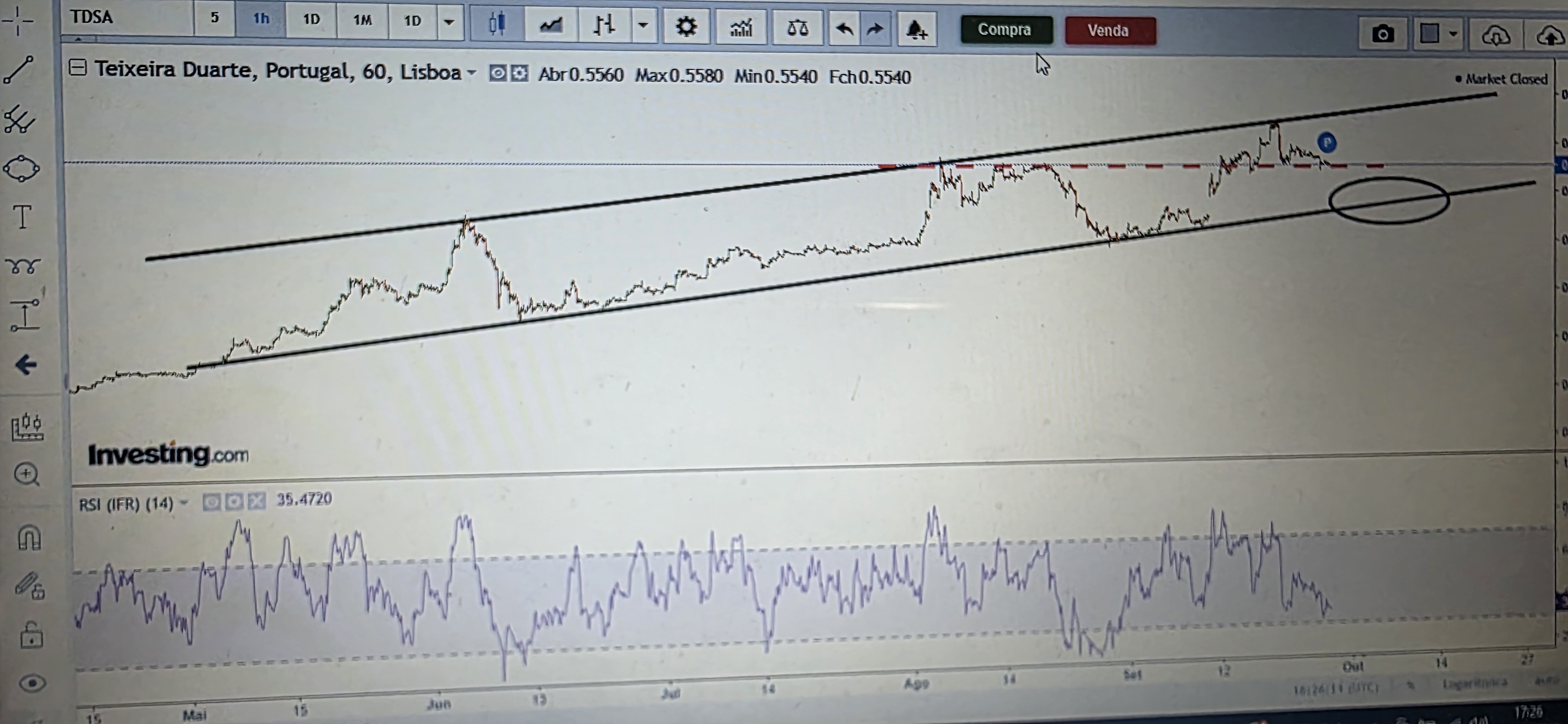 Valerá a pena esperar pelo suporte mais abaixo em 0.53, ou este suporte mais frágil em 56 funciona e a ação vai para cima? Pode acontecer...