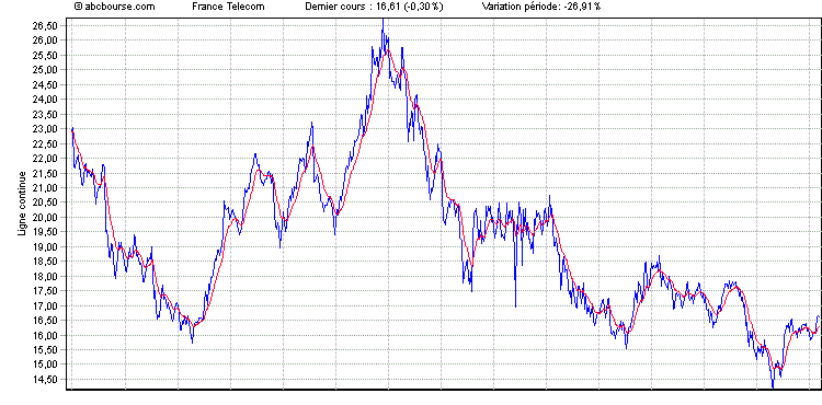 No longo prazo, e exceptuando um pico entre Outubro de 2007 e Fevereiro de 2008, a France Telecom segue a lateralizar entre os € 12,00 e os € 18,50 desde meados de Maio de 2003 (!!). A lateralização é tão forte que, no tal pico que referi, a cotação sequer alcançou os € 22,00.