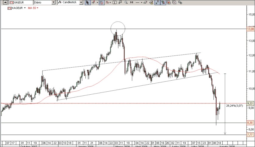no entanto anexo um gráfico da prata face ao euro,com um H&S claramente desenhado, que pode ajudar a pensar até onde ou quando se deve prudentemente esperar.