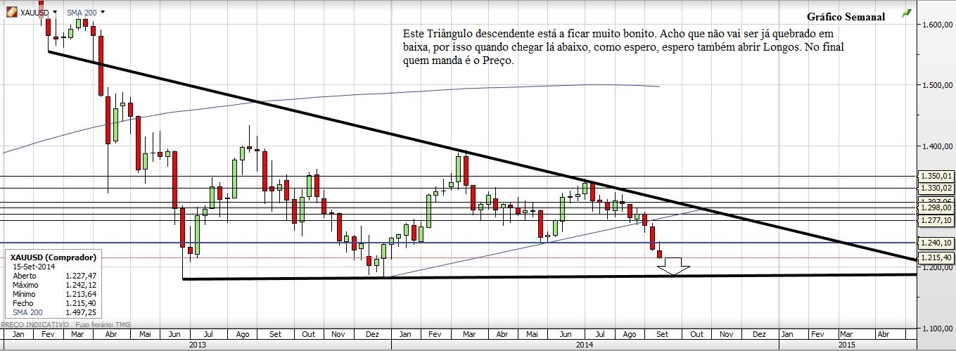 Curto no Ouro. Estava à espera de um ressalto forte, mas afinal a força esmoreceu-se muito cedo e por isso o Longo não durou muito. Hoje isso está-se a confirmar, para além de que me parece existir uma semelhança entre o que aconteceu no final de Agosto e o padrão de velas que se começa a desenhar. Se calhar o Preço vai mais cedo à base do Triângulo e quem sabe se não o quebra já. Outras opiniões?