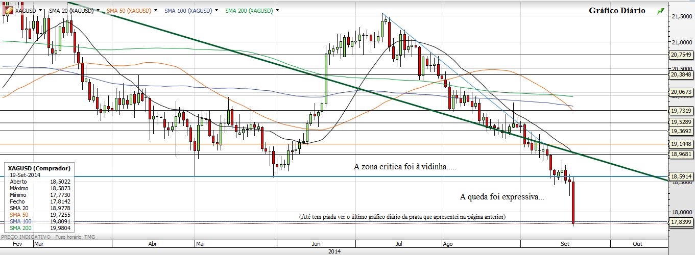Tanto o Ouro como a Prata entraram em zonas de importante suporte. Furar estes suportes não deverá ser mel, mas na Prata acho que se aplica um certo provérbio da grande ciência que é a Sabedoria Popular e que reza o seguinte: «água mole em pedra dura tanto dá até que fura». Se furar de vez vai ser bonito (para os curtos claro). E como Ouro e Prata andam de mãos dadas também vai ser bonito ver o Ouro (para os curtos claro). Seria muito importante o Ouro ir abaixo dos 1240 e fazer um mínimo mais baixo que o de Maio/Junho. Quem sabe não haverá nos próximos dias uma daquelas velas bem compridinhas (e desta vez que seja encarnadinha) que volta não volta aparecem por aqui.