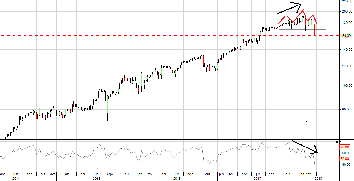Quando acções estão no topo, após subida de 10 anos do mercado americano, algo que desagrade aos investidores provoca vendas massivas devido ao elevado volume de lucros acumulados na subida .