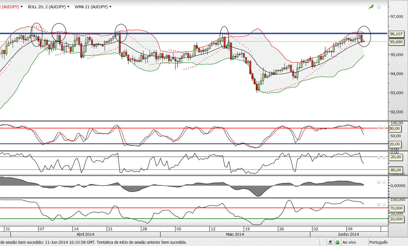 - A cotação não conseguiu, até ao momento, subir acima da forte resistência que se situa sensivelmente nos 96,10 - 96,20 (linha horizontal a azul no gráfico), sendo o presente o 5º toque nessa zona de resistência (ver os 5 círculos no gráfico).