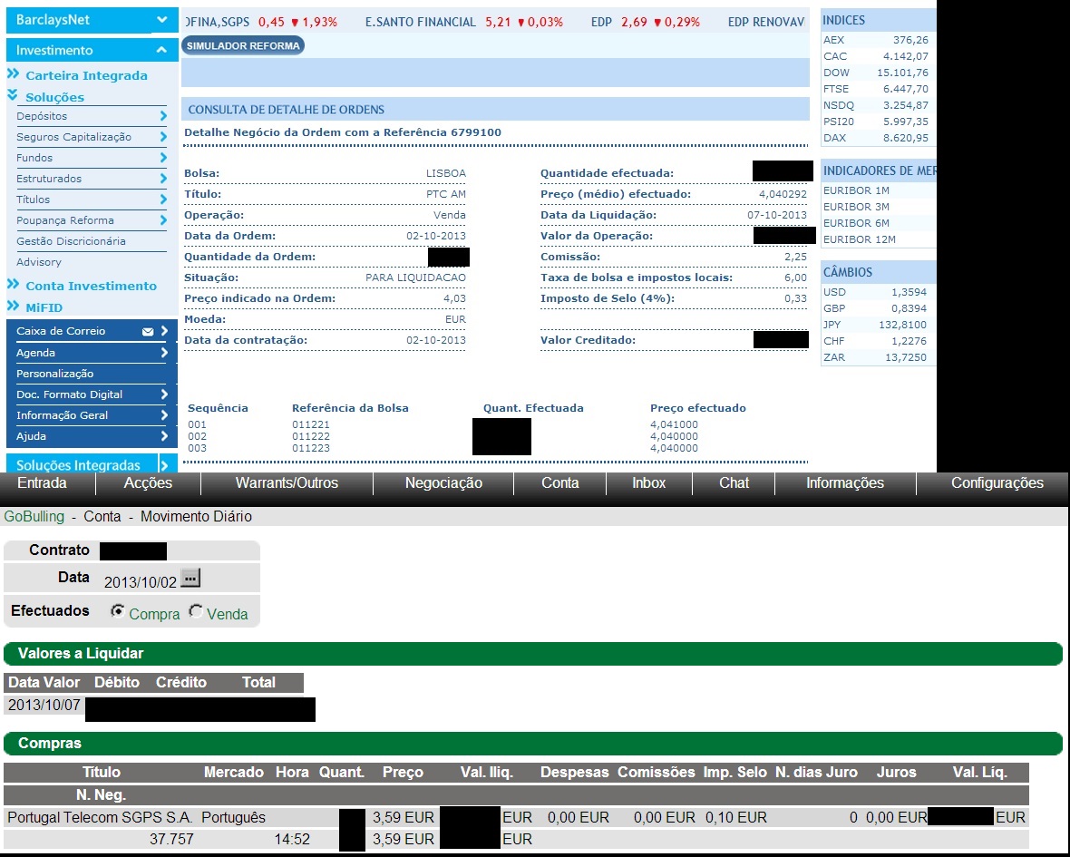 Comprei acções da PT antes do aumento de capital a 4€. Recebi quase 1000€ de dividendos. E entretanto as acções levaram uma ripada tremenda...até cerca de 2,50€. E eu comprei mais algumas a 3,20€ e a 3€, passando o preço médio para 3,73€. E ontem fiz a tal venda que referi no início deste texto, ganhando mais 1200€.
