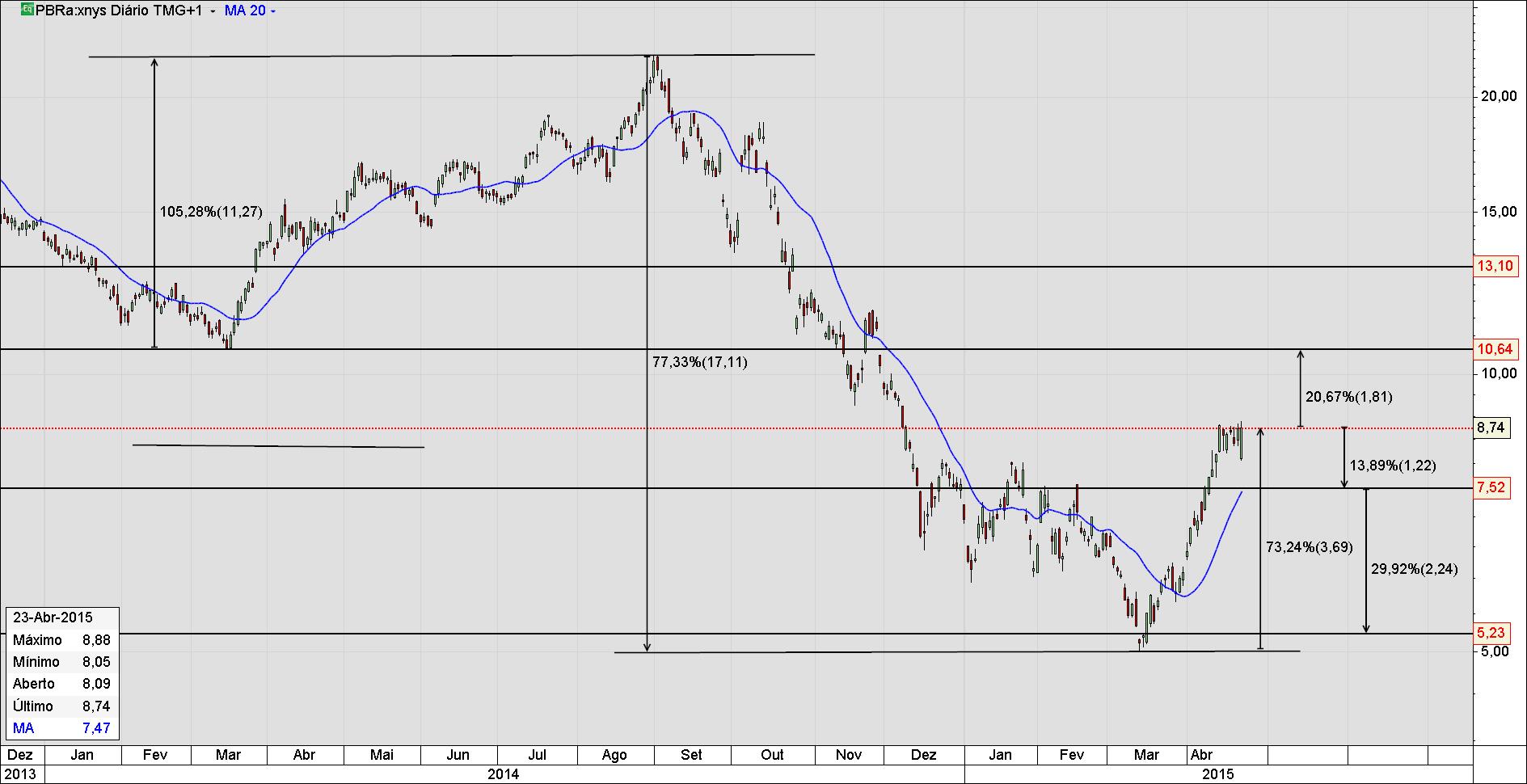 Aqui na Petrobras a semelhança gráfica do período de março 2014 com março de 2015 parece uma repetição histórica e o melhor na história é atingir os 10.64 usd do fundo anterior de março de 2014. Já não é mal. Até aqui já recuperou um bom quinhão e com a velocidade e a semelhança gráfica atingir o próximo degrau dos 13...usd em março de 2016 é um razoável objetivo. Na carteira integral dos Adrs, semelhança do IBOVESPA os ganhos são sustentáveis. Além do todo da execução de saneamento das contas publicas e privadas no Brasil o mercado está a espera da planilha de investimentos na infraestrutura que irá ser divulgada pelo Ministro Joaquim Levy em maio e desta vez com mais um elemento acrescido de financiamento gerado pelos BRICS para as infraestruturas.