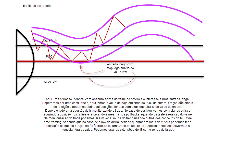 No fundo, em qualquer dos casos, se interpretei bem a ideia essencial do conceito do MP e VP (bem sei que dizes que há dezenas de formas diferentes de interpretar os gráficos e isso tem de ser tido em atenção, mas estou a tentar pôr isto numa regra geral mais prática de extração de medidas a tomar), procura-se estar atento aos pontos de limitação da “value area” para ajudar a colocar stops afastados cerca de 3 ticks fora da “value area” em zona “out balance” (2 ticks segundo a tua explicação pode ser considerada uma folga de segurança) para eventualmente aí aproveitar a reversão do aparecimento de uma nova tendência de curto prazo.