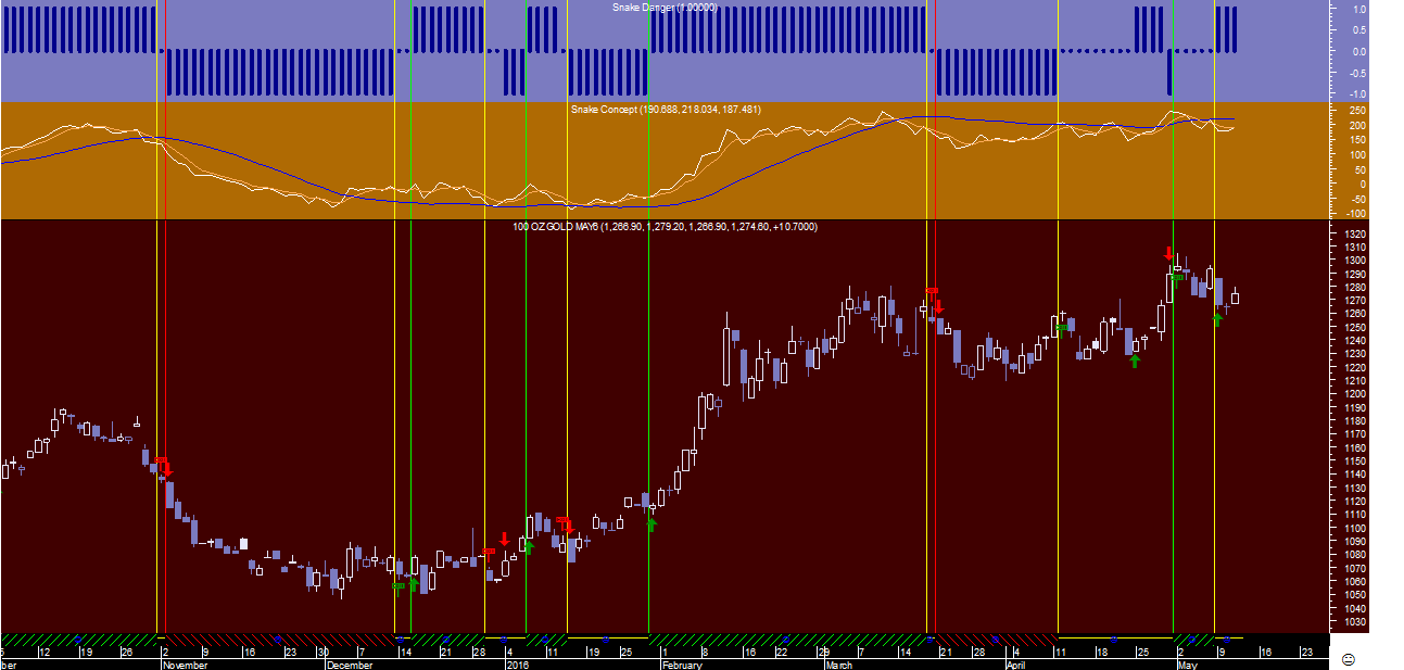 Dito isto passemos a mais um dos futuros que provoca mais paixões sobre se vale a pena estar comprado ou não, aqui vos deixo ficar então o gráfico diário do Ouro com os “vómitos” da “Cobra” nos últimos 8 meses.