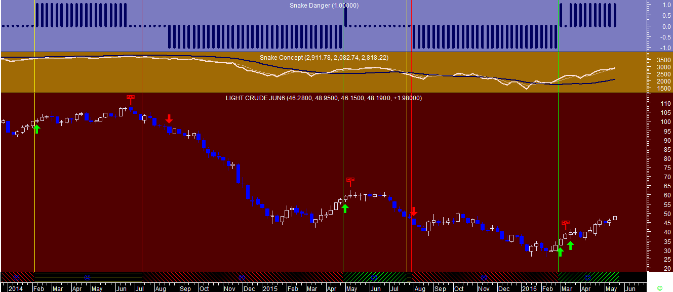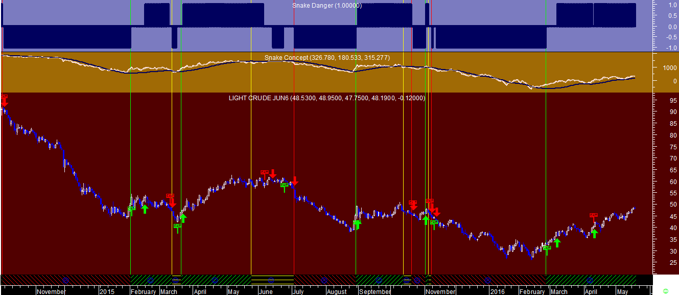 - Os indicadores do meio são o núcleo em que se baseia a “Cobra”: o indicador branco é o caminho seguido pelo bicho e o azul não é mais que um “leading indicator” apontando o sentido e o caminho previsível que o réptil deverá ou deveria tomar no futuro, procurando os topos e bases do mercado de curto prazo ao assimilar o esgotamento da direção de determinado caminho, de modo a que o mesmo seja o mais curto possível para apanhar as suas presas. Enfim, este conceito revolucionário até dava enredo para um filme em Hollywood!