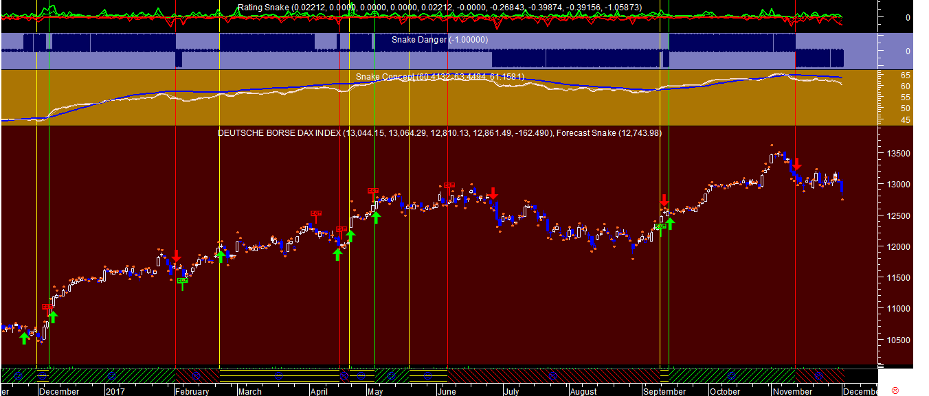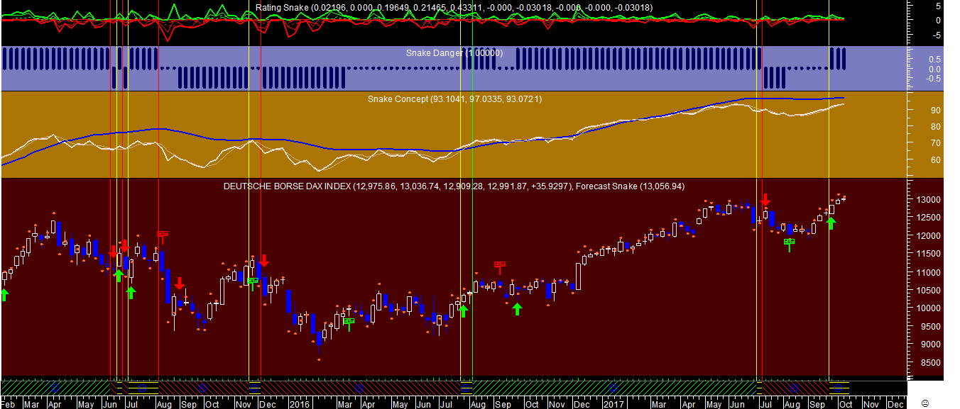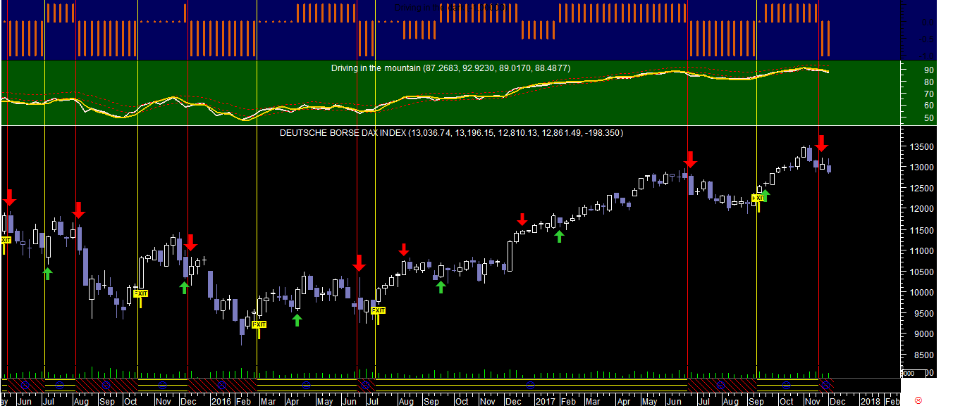 A seguir apresento uma dicotomia de dois gráficos do DAX nas esacalas diária e semanal, com a particularidade de no primeiro caso se registar um sinal de travagem que justifica algum cuidado a vigiar apesar do otimismo generalizado do conjunto que se vai mantendo.