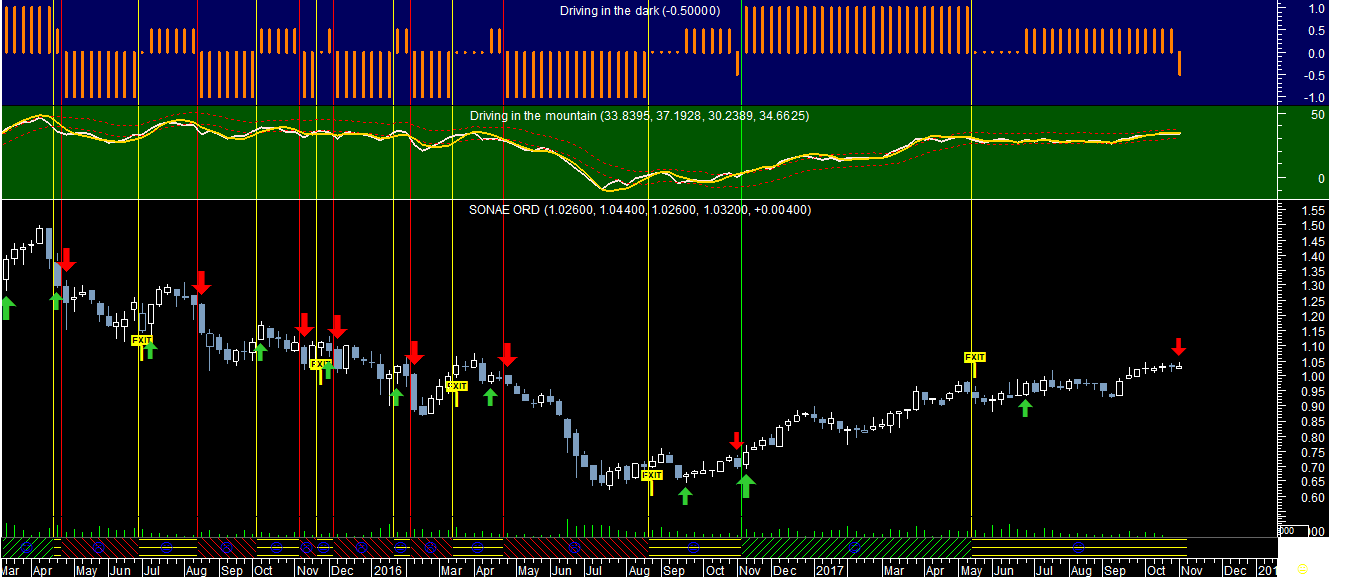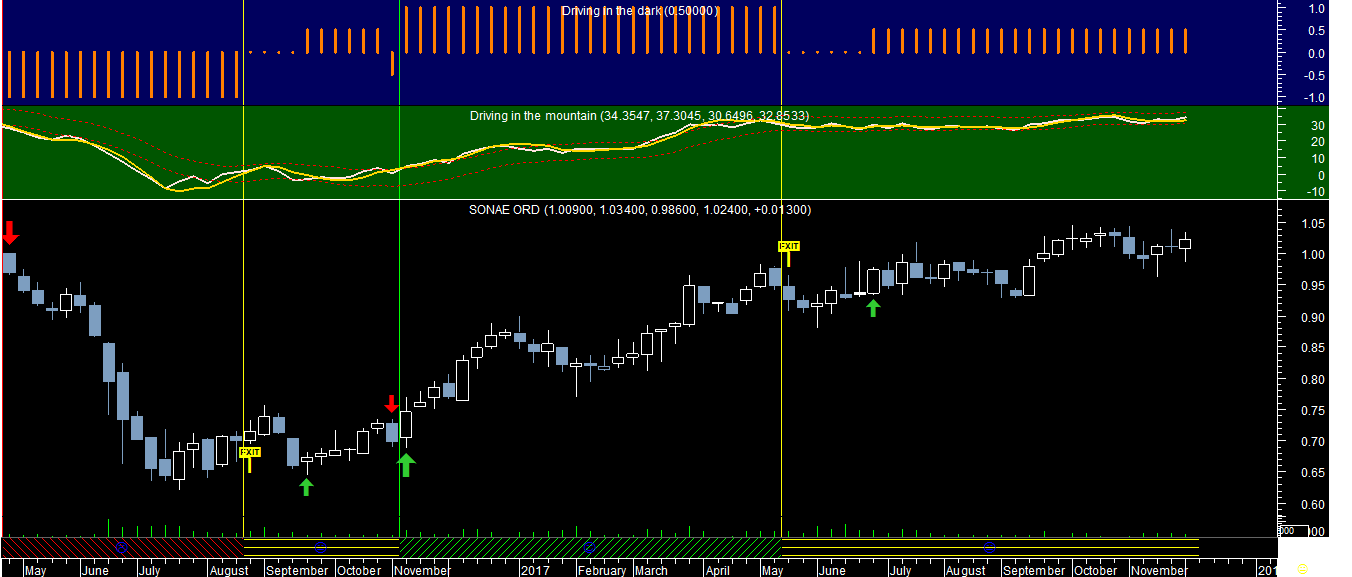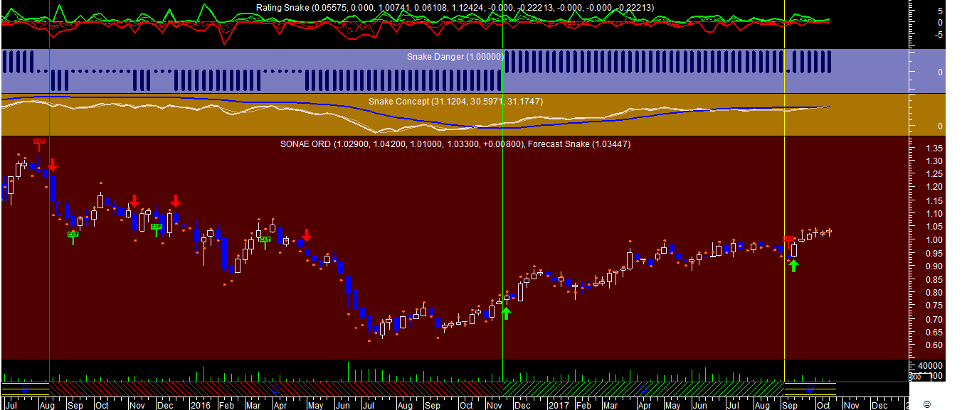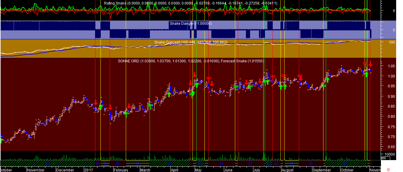 Por acaso ainda nao existe nenhuma alteraçao posicional em relaçao à última mensagem, em todo o caso trago abaixo para publicar o gráfico com um dos sistemas de trading aplicado à Sonae, com uma chamada de atençao para o perigo de nos estarmos a aproximar de um nível de topo que poderá estar numa zona de possível reversao. Repito, no caso da Sonae a resultante atual para já ainda aponta para manter posiçoes compradas, embora redobrando os cuidados no padrao atual deste mercado.