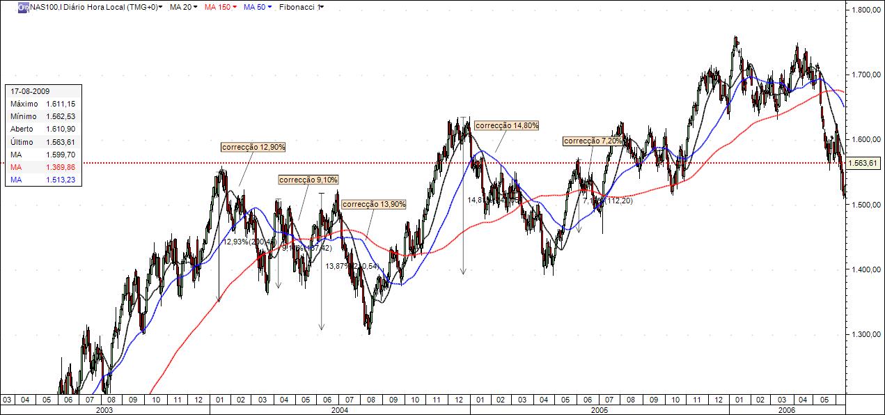Não contrario pois não disponho desse dado estadistico. No entanto uma analise grafica do periodo de 2003 a 2007 indica aquilo que eu disse: retracements maximo de cerca de 50 pontos!