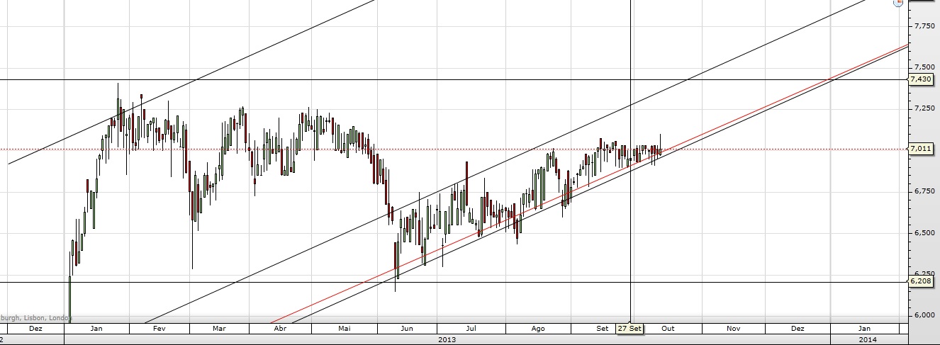Efetuou um breakout nos 7,310, após rompimento do triangulo ascendente formado a meados do Q2 de 2013.