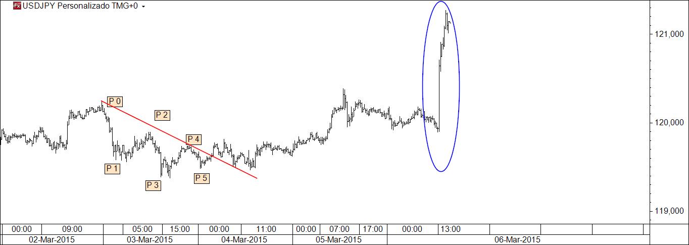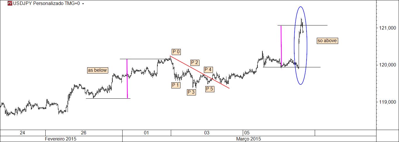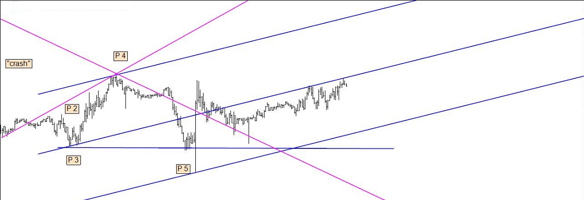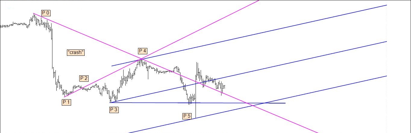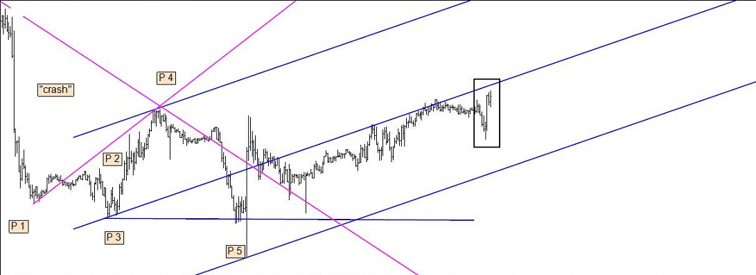 Se o P 5 falhar, é essa a informação de que preciso para me inclinar para a inversão (quando o que é suposto acontecer segundo certa regra não acontece, sucederá o seu inverso com elevada probabilidade). Se o P 5 não falha, a resposta poderá ser dada usando as linhas ou recorrendo ao puro price action. Este, ao contrário daquelas, não se aprende em fóruns ou blogs, mas na prática: vendo centenas e centenas e centenas de gráficos, dos mais variados activos e timeframes. A técnica da "falha do P 5" bem podia ter outro nome: a técnica "quando Elliott se engana".